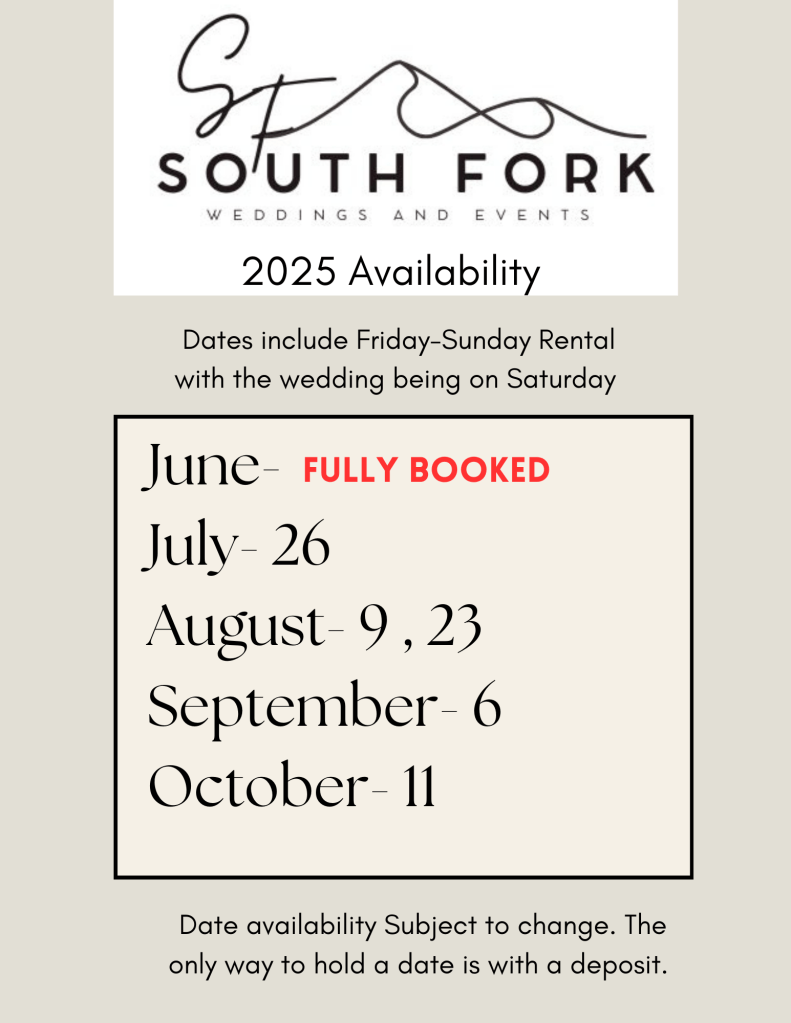 If you would like to reserve a date please email Manager.SouthFork@gmail.com to set up your personal consultation. Our team will help you with the next steps on booking.